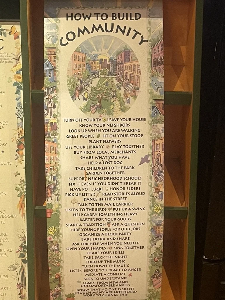 I stood for a while in front of this sign outlining the ways to build community and got a little misty eyed. I don’t know if it was the deep resonance with my soul calling, or a little bit of grief that it took me so long to realize that this is what’s most important to me, or a deep sense gratitude for someone else building this space and making these intentional little choices to draw people closer together, but I was feeling the feels for sure.